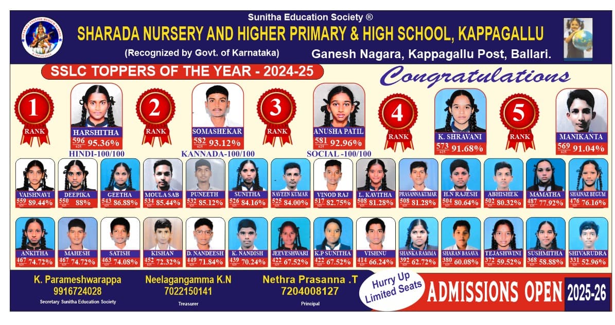 Sharada Higher Primary and High School, with over 20 years of dedicated service, proudly empowers 728 students aged 3 to 16 through holistic education. We are committed to nurturing future-ready individuals by balancing academic excellence with sports, dance, creative arts, and community service. Our mission is to ensure every child achieves their fullest potential, excelling in all areas of development. With a focus on fostering curiosity, creativity, and compassion, we provide a dynamic learning environment that prepares students to thrive in a rapidly evolving world, shaping them into confident, well-rounded individuals ready to make a positive impact.